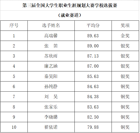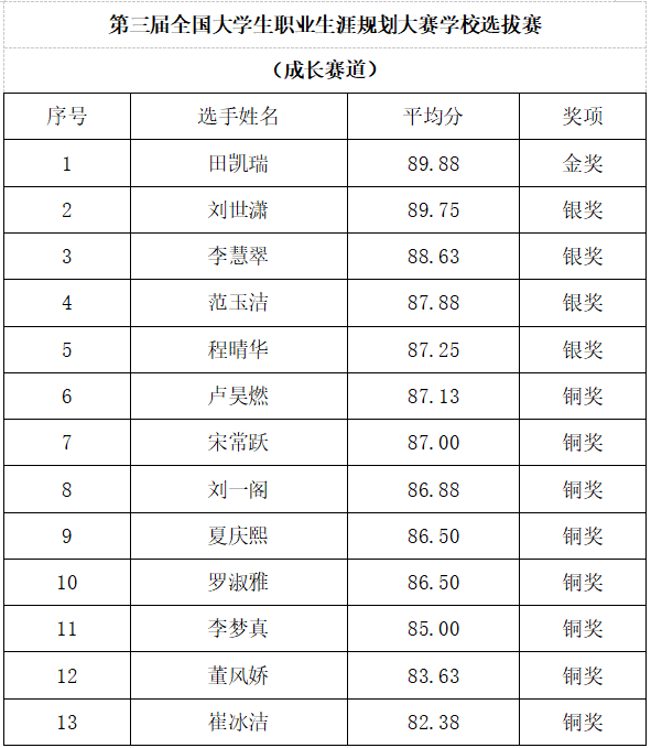 为深入贯彻落实教育部关于加强大学生职业规划教育的相关要求,引导学生树立正确的职业观、就业观和成才观,根据《关于举办第三届山东省大学生职业规划大赛暨第三届全国大学生职业规划大赛山东省选拔赛的通知》有关要求,经过二级学院推荐、学校决赛展示评审,现将第三届全国大学生职业规划大赛曲阜远东职业技术学院校级选拔赛结果予以公示,以下附获奖名单。如对结果有异议,请反馈至招生就业处。